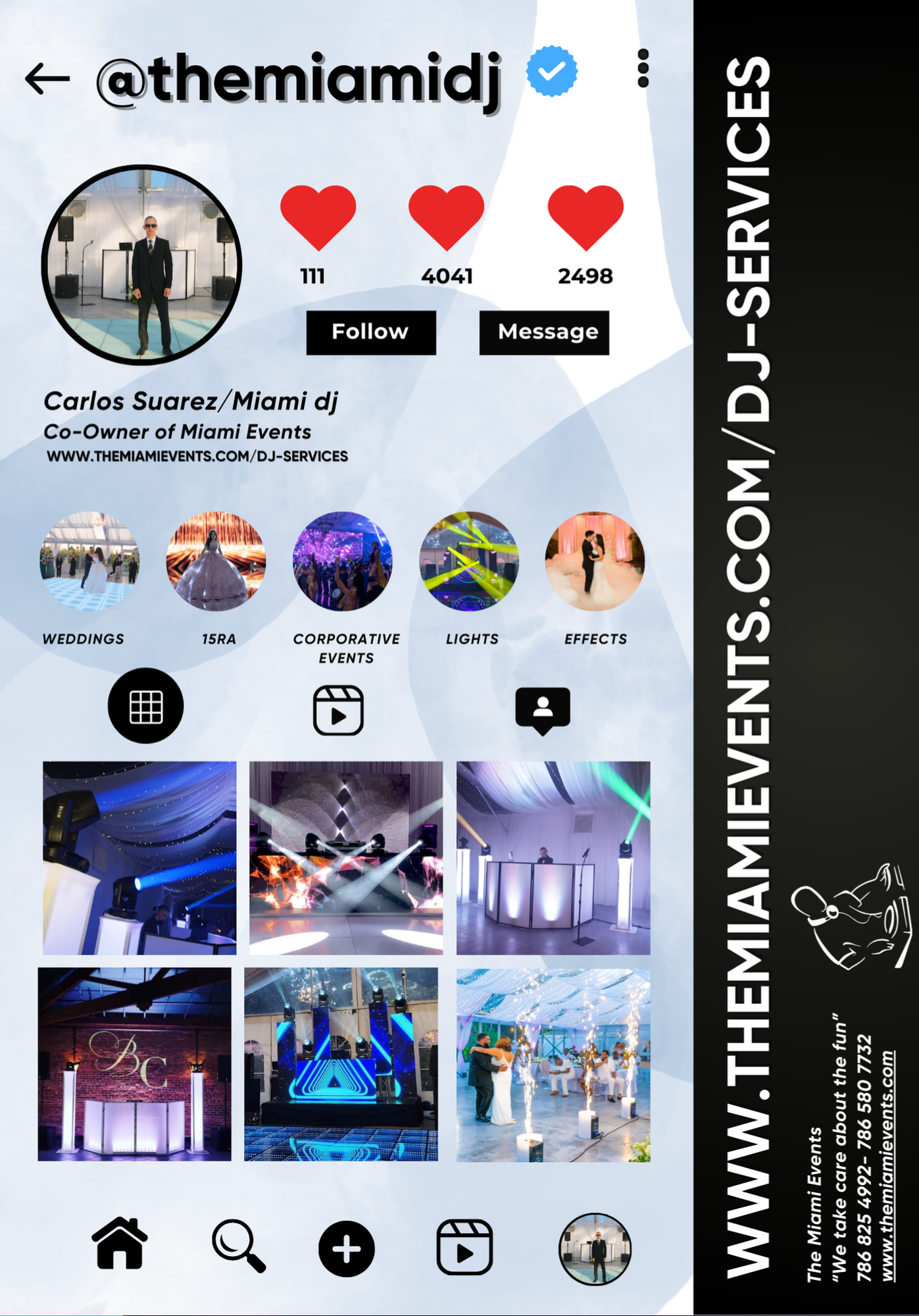 Cory Hartstein14 March 2023 Everything about Marcos and the music he played was professional and exceeded our expectations. I would recommend him 100%. This event was fantastic with his help. Hire him asap if you want to elevate any event. Maidelys Pupo13 March 2023 Exelente presentación,disfrutar de su talento 👋👋👋 Jen Wackenhut26 February 2023 Marcos and Carlos were both very easy to work with and accommodating, even last minute changes and asks. Everyone had the best time at our wedding. thank you! Carlos Suarez4 January 2023 Unbeatable package, DJ service with a performance by an excellent violinist 100% coupled... plus Photobooth 360 service. Marcos del Risco4 January 2023 Best Miami Entertainment Company.